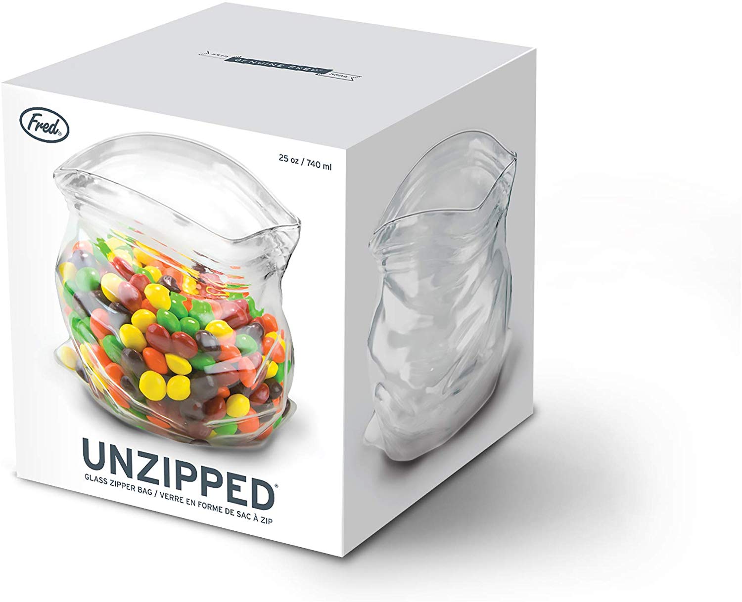 This hand-blown glass bowl is shaped exactly like an unzipped disposable plastic bag with realistic looking crinkled edges and sides. It features a flat base to provide stability on countertops and tables and makes a fun and quirky way to hold candy or even a goldfish. It also comes packaged in a gift box ready for gifting.